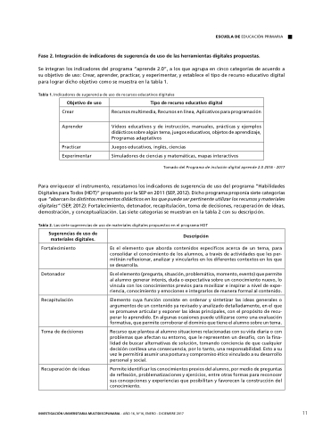 Para enriquecer el el instrumento rescatamos los indicadores de de de de sugerencia de de de de uso del programa “Habilidades Digitales para Todos (HDT)” propuesto por la SEP SEP en 2011 (SEP 2012) Dicho programa proponía siete categorías que que “abarcan los los los distintos momentos didácticos en en en los los los que que puede ser pertinente utilizar los los los recursos y materiales digitales” (SEP 2012): Fortalecimiento detonador recapitulación toma de de de de de decisiones recuperación de de de de de ideas demostración y conceptualización Las siete categorías se muestran en la la tabla 2 con con su descripción Tabla 2 Las siete sugerencias de de uso de de materiales digitales propuestos en en el programa HDT Sugerencias de de uso de de materiales digitales Descripción