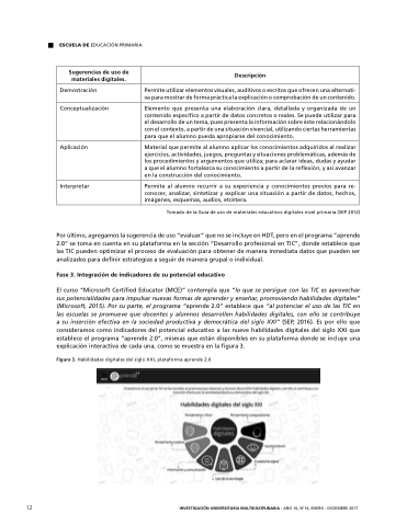 Por último agregamos la sugerencia de de uso “evaluar” que no se incluye en en en en HDT pero en en en en el programa “aprende 2 0” se se toma en en en en en cuenta en en en en en su plataforma en en en en en la la sección “Desarrollo profesional en en en en en TIC” donde establece que las TIC pueden pueden optimizar el proceso de de de de evaluación para obtener de de de de manera inmediata datos que pueden pueden ser analizados para definir estrategias a a a a a a a a a a a a seguir de de manera grupal o o individual Fase 3 Integración de de indicadores de de su potencial educativo El curso “Microsoft Certified Educator (MCE)” contempla que que “lo que que se persigue con con las TIC es aprovechar sus potencialidades para impulsar nuevas formas de de de de aprender y enseñar promoviendo habilidades digitales” (Microsoft 2015) Por su parte el el programa “aprende 2 2 0” establece que “al potenciar el el uso de de las TIC en en en las las escuelas se se promueve que docentes y y alumnos desarrollen habilidades digitales con con ello se se contribuye a a a a a á a su inserción efectiva en la sociedad productiva y democrática del siglo XXI” (SEP 2016) Es por ello que consideramos como indicadores del del potencial educativo a a a a a a a a a las nueve habilidades digitales del del siglo XXI que establece el programa “aprende 2 0” mismas que están disponibles en en su plataforma donde se incluye una explicación interactiva de cada una como se muestra en la figura 3 Figura 3 Habilidades digitales del siglo XXI plataforma aprende 2 0 12 INVESTIGACIÓN UNIVERSITARIA MULTIDISCIPLINARIA - - AÑO 16 16 No16 ENERO - - DICIEMBRE 2017
