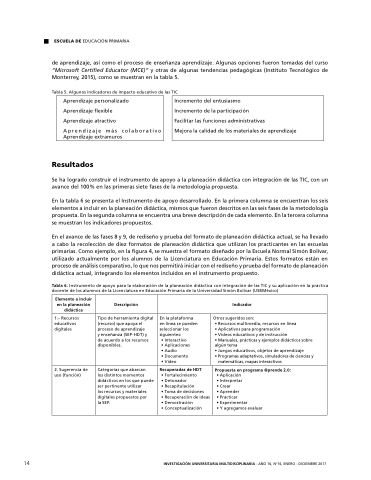 con con con un avance del 100% en las primeras siete fases de de la la metodología propuesta En En la la la la tabla 6 se se se se presenta el Instrumento de de apoyo desarrollado En En la la la la primera columna se se se se encuentran los seis elementos a a a a á a a a a a incluir en en en la la la la planeación didáctica mismos que fueron descritos en en en las seis fases de de la la la la metodología propuesta En En la la segunda columna columna se se encuentra una breve descripción de de cada elemento En En la la tercera columna columna se muestran los indicadores propuestos En el el avance de de de de las fases 8 y y 9 de de de de rediseño y y prueba del formato de de de de planeación didáctica actual se se se ha llevado a a a a a a á a a a a a a cabo la la la la recolección de de diez formatos de de planeación didáctica que utilizan los practicantes en las las escuelas primarias Como ejemplo en e la la la figura 4 se se muestra el el formato diseñado por la la la Escuela Normal Simón Bolívar utilizado actualmente por los alumnos de la Licenciatura en en en en Educación Primaria Estos formatos están en en en en proceso de de de análisis comparativo lo que nos permitirá iniciar con el el rediseño y prueba del formato de de de planeación didáctica actual integrando los elementos incluidos en en en el el instrumento propuesto Tabla 6 Instrumento de de de apoyo para la la la la la la la elaboración de de de la la la la la la la planeación didáctica con integración de de de las TIC