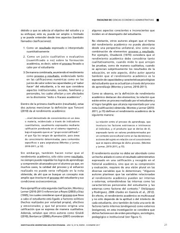 La relación entre el el proceso de aprendizaje que involucra los factores extrínsecos e e e e e intrínsecos al individuo y el producto que se deriva de de él expresado tanto en valores predeterminados por un contexto sociocultural como en las decisiones y acciones del sujeto en en relación con con el el el conocimiento que se espera obtenga de dicho proceso (Montes y Lerner 2010-2011 p 15) El rendimiento escolar no debe ser abordado como un hecho aislado ni ni como el resultado administrativo expresado en en una calificación y recogido en en el historial académico sino que en en su comprensión y evaluación requiere de una visión plural en las diversas variables que lo determinan “Algunos autores plantean que las variables relacionadas al rendimiento académico pueden ser internas o o o o externas entendiéndose las las internas como las las características personales del estudiante y las externas como factores del contexto ” (Velázquez y Rodríguez 2006 citados en Gaxiola et al 2012) En efecto el rendimiento académico es multicausal y no sólo depende de de de de de la aptitud o ó o o o del intelecto de de de de de cada estudiante sino también de de toda una serie de de factores tanto internos (endógenos) como externos (exógenos) en en esta investigación se considera que dichos factores son de de orden psicológico sociológico pedagógico e e e institucional (ver figura 1) INVESTIGACIÓN UNIVERSITARIA MULTIDISCIPLINARIA - - AÑO 16 16 No16 ENERO - - DICIEMBRE 2017