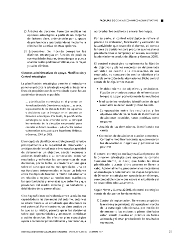 planificación estratégica es es es el proceso de formalización de de la Dirección estratégica es es decir la la la plasmación de de los los planes de de todos los los supuestos y decisiones que se integran en el proceso de de Dirección estratégica Por tanto la la planificación estratégica se debe entender como la principal herramienta de la dirección empresarial para concebir un futuro deseable y diseñar los medios y alternativas adecuados para llegar hasta él (Navas y Guerras 2001 p 580) El concepto de planificación estratégica está referido principalmente a a a a a a a la capacidad de observación y anticipación del estudiante e e e e involucra la capacidad de de determinar un objetivo asociar recursos y acciones destinados a a a a a su consecución examinar resultados y enfrentar las consecuencias de esas decisiones por lo tanto se convierte en una guía sobre el curso que estima más apropiado Una de sus funciones instrumentales es es es hacer un un balance entre tres tipos de de fuerzas: la misión del estudiante en en en relación a a a a a mejorar su rendimiento académico las oportunidades y y amenazas que que enfrenta y y que que provienen del medio externo y y las fortalezas y y debilidades de de de su personalidad Si no hay suficiente coincidencia entre la misión sus capacidades y las demandas del entorno entonces se estará frente a á a a un estudiante que desconoce su real potencial Por el contrario un claro sentido de lo que es es su misión permite guiar las decisiones sobre qué oportunidades y amenazas considerar y cuáles desechar Un efectivo plan estratégico ayuda a a a a a a a reconocer potencialidades y y limitaciones a a a a a a a aprovechar los los desafíos y a a a a a a encarar los los riesgos Por su parte el control estratégico se refiere al proceso de de evaluación fiscalización y valoración de de las actividades que desarrolla el alumno así como a a a a a a a a la la toma de de decisiones para procurar que los planes preestablecidos se se cumplan y en su caso se se corrijan las desviaciones producidas (Navas y Guerras 2001) El control estratégico complementa la fijación de de objetivos y planes concretos en determinada actividad en cuanto a a a a a a la observación de sus resultados su su comparación con los objetivos y la posible corrección de de las desviaciones Dicho control consta de las siguientes etapas: