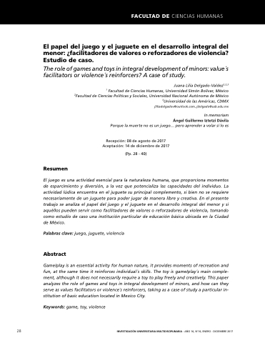 el el el el el desarrollo integral del del menor: ¿facilitadores de de de de de de valores o o o o o o o o o o o o reforzadores de de de de de de violencia? Estudio de caso The role of of of games and toys in in in in integral development of of of minors: value´s facilitators or or or violence´s reinforcers? A case of of of study 28 INVESTIGACIÓN UNIVERSITARIA MULTIDISCIPLINARIA - - AÑO 16 16 No16 ENERO - - DICIEMBRE 2017