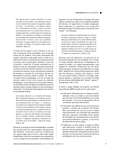 • El educativo: básicamente en en el espacio escolar utilizado como un un medio o o o o o una herramienta que favorece las formas didácticas por parte del docente y una vía de de de apropiación de de de los contenidos por parte del alumno • El recreativo: que define su uso como una forma positiva y creativa de de ocupación del tiempo libre una actitud de ocio en la que el sujeto elige libremente una actividad que garantiza diversión descanso -entendido como cambio de actividad y no necesariamente como asumir una una actitud sedentaria o o pasiva- y una una forma de de de desarrollo de de de quien juega • El deportivo: en este campo el juego se utiliza para aproximar a a a a a a a a a a quien lo practica hacia las formas motoras genéricas y específicas de la disciplina deportiva incluyendo sus ejecuciones técnicas el acercamiento a a a a a a á a las formas tácticas y estratégicas así como las normativas INVESTIGACIÓN UNIVERSITARIA MULTIDISCIPLINARIA - - AÑO 16 16 No16 ENERO - - DICIEMBRE 2017 31