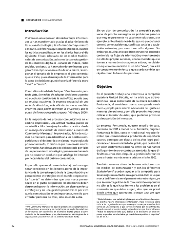 En el presente trabajo analizaremos a a a a a a a a a la compañía española United Biscuits en la la crisis que atrave- saron las líneas comerciales de la la marca repostera Fontaneda al considerar que su caso puede servir como ejemplo para marcas nacionales de iguales o o o o o menores dimensiones y con ello prevenir situaciones críticas al interior de éstas que pudieran provocar su desaparición del mercado La empresa Fontaneda nuestro estudio de caso comenzó en en en 1881 a a a manos de su fundador Eugenio Fontaneda Millán como el tradicional negocio fa- miliar que comercializaba productos de repostería caseros pero que con el paso de los años logró posi- cionarse en su comunidad a a a a a a tal grado que desarrolló un valor sentimental adicional entre los habitantes del lugar donde se se encontraba asentada lo que di- ficultó muchos años después la gestión informativa para afrontar su más severa crisis en el año 2002 También veremos cómo las buenas relaciones con los los medios de comunicación y con los los diferentes Stakeholders2 pueden ayudar a a a a a a a a a la compañía para tener mejores resultados en en alguna crisis Esto es es es lo que marca la diferencia en en en en el pensamiento estratégico ya que la la correcta gestión de la la comunicación corporativa no sólo es la que hace frente a a a a los problemas en en el momento en en en que que éstos surgen sino que que los prevé desde antes que que que aparezcan porque una vez que que que 2 Stakeholders es es una palabra inglesa que en el ámbito de de la la empre- sa sa sa significa “parte interesada o o o interesado” Hace referencia sobre todo a a a a a a a a las las organizaciones o o o o o o o personas que toman parte en las las deci- siones de de una compañía y que se ven afectadas por sus actividades Para el el caso del presente trabajo entenderemos por Stakeholders a: “todos los actores sociales que debido a a a a a las decisiones de de de una em- presa se se pueden ver afectados ya sea de de forma positiva o o o o negativa” (N de los A ) 42