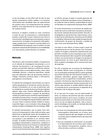 Para llevar a a a a a a á a a cabo el presente análisis nos basaremos en en en el el método de investigación documental y en en en el el método hermenéutico y de investigación-acción porque nos permiten observar y reflexionar sistemá- ticamente sobre sobre un tema determinado o o o o bien sobre sobre realidades teóricas y empíricas específicas usando para ello diferentes tipos de de documentos donde se indaga interpreta presenta datos e e e e e información para generar conocimiento El método de investigación documental es es el que se realiza apoyándose en en en fuentes de carácter documen- tal para contrastarlos con con un caso en particular esto es mediante la consulta de de documentos de de cualquier especie tales como: fuentes bibliográficas (libros) hemerográficas (artículos o o o o ó o ensayos de periódicos revistas y/o publicaciones científicas especializadas) o o o archivísticas (cartas oficios circulares expedientes) Se trata de una investigación argumentativa y explorato- ria que si si bien no precisa realizar análisis en en campo sí permite llegar a a a a una conclusión crítica después de de evaluar los datos investigados (Torres Verdugo 1998) El método hermenéutico por su parte hace refe- rencia a a a a a a la interpretación sobre todo de textos para determinar el significado exacto de de las palabras me- diante las cuales se ha expresado un pensamiento una una postura o o ó o o una una hipótesis en un un un contexto deter- minado El análisis hermenéutico se enmarca en en en el paradigma interpretativo comprensivo mediante el cual se se determina que el ser humano es naturalmente interpretativo (Guanipa-Pérez 2009) Esto significa que el el círculo hermenéutico (el proceso interpretativo)