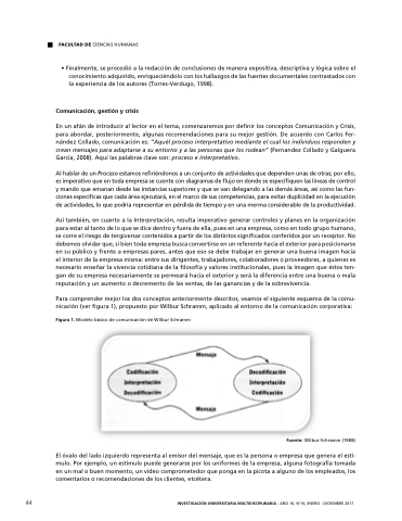 En un un afán de de introducir al lector en en el tema comenzaremos por definir los conceptos Comunicación y Crisis para para abordar posteriormente algunas recomendaciones para para su mejor gestión De acuerdo con Carlos Fer- nández Collado comunicación es: “Aquél proceso interpretativo mediante el cual los individuos responden y crean mensajes para adaptarse a a a a a a a a a a a a a a a a su entorno y y a a a a a a a a a a a a a a a a las personas que los rodean” (Fernandez Collado y y Galguera García 2008) Aquí las palabras clave son: proceso e e e e e interpretativo Al hablar de de de de de de un un un un Proceso estamos refiriéndonos a a a a a a a a un un un un conjunto de de de de de de actividades que dependen unas de de de de de de otras por ello es es es imperativo que que en en en en toda empresa se se cuente con con diagramas de de de flujo en en en en donde se se especifiquen las líneas de de de control y y mando que que emanan desde las las las instancias superiores y y que que se van delegando a a a a a a a a a a á á a a a las las las demás áreas así como las las las fun- ciones específicas que cada área ejecutará en en en el marco de sus competencias para evitar duplicidad en en en la ejecución de de de de de actividades lo que podría representar en en en pérdida de de de de de tiempo y en en en una merma considerable de de de de de la productividad Así también en en en cuanto a a a a a a a a a a a a la la la Interpretación resulta imperativo generar controles y planes en en en la la la organización para estar al tanto de de de lo que se dice dentro y fuera de de de ella pues en en en una empresa como en en en todo grupo humano se corre el riesgo de de tergiversar contenidos a a a a partir de de los distintos significados conferidos por un receptor No debemos olvidar que si si bien toda empresa busca convertirse en en en un referente hacia el exterior para posicionarse en en en en en en su público y frente a a a a a a a a a a a a a empresas pares antes que eso se debe trabajar en en en en en en generar una buena imagen hacia el interior de la la empresa misma: entre sus dirigentes trabajadores colaboradores o o o o o o o o proveedores a a a a a a a a a quienes es es es es es es es necesario enseñar la la la vivencia cotidiana de la la la filosofía y valores institucionales pues la la la imagen que éstos ten- gan de su empresa necesariamente se se permeará hacia el exterior y será la la diferencia entre una buena o o mala reputación y y un aumento ó o o o o decremento de de de de las las ventas de de de de las las ganancias y y de de de de la la la sobrevivencia Para comprender mejor los dos conceptos anteriormente descritos veamos el siguiente esquema de de de la comu- nicación nicación (ver figura 1) propuesto por por Wilbur Schramm aplicado al entorno de la comunicación corporativa:
