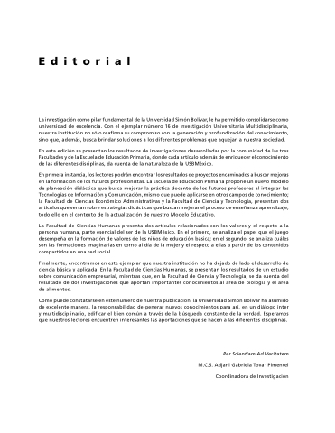 La investigación como como pilar fundamental de la la Universidad Simón Bolívar le ha permitido consolidarse como como universidad de de excelencia Con el el ejemplar número 16 de de Investigación Universitaria Multidisciplinaria nuestra institución no no sólo reafirma su compromiso con con la generación y profundización del conocimiento sino que que que además busca brindar soluciones a á a a a a a a a a a los diferentes problemas que que que aquejan a á a a a a a a a a a nuestra sociedad En esta edición se se presentan los resultados de de de investigaciones desarrolladas por la la la comunidad de de de las tres Facultades y de de de de de de la la Escuela de de de de de de Educación Primaria donde cada artículo además de de de de de de enriquecer el el conocimiento de de de las diferentes disciplinas da cuenta de de de la la la naturaleza de de de la la la USBMéxico En primera instancia los los lectores podrán encontrar los los resultados de proyectos encaminados a a a á a a a a a a a buscar mejoras en la la formación de de de los futuros profesionistas La Escuela de de de Educación Primaria propone un nuevo modelo de de planeación didáctica que busca mejorar la la la práctica docente de de los futuros profesores al integrar las Tecnologías de de de Información y Comunicación mismo que puede aplicarse en en otros campos de de de conocimiento la la Facultad Facultad de de Ciencias Económico Administrativas y y la la Facultad Facultad de de Ciencia Ciencia y y Tecnología presentan dos artículos que que versan sobre estrategias didácticas que que buscan mejorar el proceso de enseñanza aprendizaje todo ello en el el el contexto de de de la actualización de de de nuestro Modelo Educativo La Facultad de Ciencias Humanas presenta dos dos artículos relacionados con los los valores y el el respeto a a a a a a a a a a a a a la la persona humana parte esencial del ser de de la USBMéxico En el el el el el primero se se se analiza el el el el el papel que el el el el el juego desempeña e en en la formación de de de de valores de de de de los niños de de de de educación básica e en en el segundo se se se analiza cuáles son las las formaciones imaginarias en en torno al día de de la la la mujer y el el respeto a a a a a a a a a a a a ellas a a a a a a a a a a a a partir de de los contenidos compartidos en una red social Finalmente encontramos en en en este ejemplar que nuestra institución no ha dejado de de de de lado el desarrollo de de de de ciencia básica y aplicada En la Facultad de de Ciencias Humanas se se presentan los resultados de de un estudio sobre comunicación empresarial mientras que en en en en la Facultad de de Ciencia y Tecnología se da cuenta del resultado de de dos investigaciones que aportan importantes conocimientos al área área de de biología y el área área de alimentos Como puede constatarse en este número de de nuestra publicación la Universidad Simón Bolívar ha asumido de de excelente manera la responsabilidad de de generar nuevos conocimientos para así en en en en un diálogo inter y multidisciplinario edificar el bien común a a a a a a a a a a través de de la la búsqueda constante de de la la verdad Esperamos que que nuestros lectores encuentren interesantes las las aportaciones que que se hacen a a a a a a a a las las diferentes disciplinas Per Scientiam Ad Veritatem