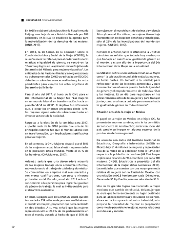 En 1995 se elaboró la la la la la Declaración y la la la la la Plataforma de Beijing una hoja de ruta histórica firmada por 189 gobiernos en en la la cual se estableció la la agenda para la la materialización de de de los derechos de de de las mujeres (ONU 2017) En 2014 la la la 58 Sesión de la la la Comisión sobre la la la Condición Jurídica y Social de la la Mujer (CSW58) la la reunión anual de Estados para abordar cuestionares relativas e e e é e e e e igualdad de género se centró en en los “Desafíos y logros en la aplicación de de los Objetivos de de Desarrollo del Milenio para mujeres y las niñas” Las entidades de de las las Naciones Unidas y las las organizaciones no gubernamentales (ONG) acreditadas por ECOSOC debatieron sobre los los avances realizados y los los retos pendientes para cumplir los ocho objetivos de Desarrollo del Milenio Para el el el el año del 2017 el el el el tema de de la ONU para el el el el Día Internacional de la Mujer fue “Las mujeres en en un un un mundo laboral en en transformación: hacia un un un planeta 50-50 en 2030” El objetivo fue reflexionar que a a pesar los enormes progresos desde 1975 las mujeres siguen estando subrepresentadas en en en diversos sectores de la sociedad Respecto a a a á a a a la la elección de la la temática para 2017 el portal web de de la la ONU precisa que una de de las principales razones fue que el mundo laboral está en transformación con implicaciones significativas para las mujeres En tal contexto la ONU-Mujeres destacó que el 50% de las mujeres en en edad laboral están representadas en en la la población activa mundial frente al al 76 % de los hombres (ONUMujeres 2017) Además señala que una abrumadora mayoría de las mujeres trabaja en la la economía informal subvencionando el trabajo de cuidados y doméstico Se concentran en en empleos mal remunerados y con con menos cualificaciones con con poca o o o o o o ninguna protección social Por ello en el el año 2017 se buscó concientizar a a a a a a a a a a las personas para lograr la la igualdad de de género de de trabajo la cual es indispensable para el desarrollo sostenible En tanto la la página web de la la UNESCO señaló que dos tercios de de los 774 millones de de personas analfabetas en el mundo son mujeres proporción que no ha cambiado en e dos décadas A su vez señaló que las mujeres representan sólo el 23 3% de los parlamentarios en en en todo el el mundo aunado al hecho de de que el el 35% de de las mujeres en en el mundo han sido víctimas de violencia física y/o sexual Por último las mujeres tienen baja representación en en en disciplinas científicas y tecnológicas sólo el el 29% de de las investigadoras del mundo son mujeres (UNESCO 2017) Por todo lo anterior tanto la la ONU como la la UNESCO coinciden en en e señalar que todavía hay mucho por qué trabajar en en cuanto a a a a a a a a la igualdad de género en en el el el mundo y es por por ello de de la importancia del Día Internacional de la la Mujer en la la actualidad La UNESCO define al al Día Internacional de de la Mujer como “la celebración mundial de todas las mujeres en todas partes Un llamado a a a a a a a a a la la unidad para reflexionar sobre las lecciones aprendidas y para incrementar los esfuerzos puestos hacia la igualdad de de de género y el empoderamiento de de de todas las niñas y las mujeres Es un día para regocijarse en los extraordinarios actos de las mujeres y para trabajar juntas como una fuerza unitaria para avanzar hacia la igualdad de género en todo el mundo” Situación actual de la mujer en México