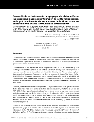 (USBMéxico) ha integrado como parte de de de un convenio educativo desde el año 2014 así como también otras otras herramientas digitales disponibles en en en internet y otras otras sugeridas en en en los libros de de de de la Secretaría de de de de Educación Pública (SEP) y en en el el portal del programa aprende 2 0 (SEP 2016) Si bien el el propósito de de incluir estas asignaturas en en el el plan de de estudios es es es “mejorar la la práctica de de de los docentes incidiendo en en en la la calidad del sistema educativo mediante el el uso de de de las TIC” (SEP 2013) y y que dichas asignaturas “sirvan como apoyo al logro de competencias profesionales y genéricas de de de los futuros docentes de de de educación básica” debería entonces existir una sistematización en el proceso de de planeación con integración de de las Tecnologías de de la la la Información y la la la comunicación (TIC) que se viera reflejada en el formato de de planeación didáctica actual que utiliza el el alumno en en en formación la la la cual presenta y aplica en en en las las escuelas primarias de práctica Se realizó una investigación de de tipo cualitativa que permitió desarrollar un un instrumento que sirva de apoyo para facilitar a a a a a a a a a a a a a a á a los alumnos llevar a a a a a a a a a a a a a a á a cabo la la planeación didáctica con integración de las TIC Dicho instrumento integra integra seis elementos: El recurso recurso (o recursos) digitales digitales a a a a á a a a a utilizar la función que tendrá su potencial educativo (competencias digitales digitales INVESTIGACIÓN UNIVERSITARIA MULTIDISCIPLINARIA - - AÑO 16 16 No 16 16 ENERO - - DICIEMBRE 2017 7 7 lidia@usb edu edu mx mx axel paredes me@usb edu edu mx mx ESCUELA DE EDUCACIÓN PRIMARIA