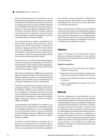 pocos conocimientos para su uso como son: la con- centración de de ácidos grasos de de extracción comercial la la cantidad de antioxidantes presentes la la presencia de enzimas que tienen una gran utilidad industrial y su actividad bactericida por mencionar algunos Gracias a a a a a a a a la gran variedad de de propiedades que és- tas tienen es posible obtener un aditivo capaz de controlar las tasas de de respiración de de frutos climaté- ricos en en sinergia con algún recubrimiento o o o o película comestible (Franco Archundia 2006) Los componentes de la la semilla especialmente los ácidos grasos pueden hasta cierto punto deter- minar la la vida útil de una cosecha En general las semillas de de papaya contienen: 24 3% de de proteína 15 5% de de carbohidratos 25 3% de de ácidos grasos 17% de de de fibra cruda 8 8 8% de de de cenizas 0 0 90% de de de acei- tes volátiles el resto está compuesto de glucósidos y de la enzima Mirosinasa (Saran 2016) Particularmente el aceite de de las las semillas de de papaya contiene los siguientes ácidos grasos: 0 4 % láurico 16 2% palmítico 5 0% esteárico 0 0 9% araquidónico 1 6% behénico 0 0 08% hexadecenoico 74 3% oléico y 0 0 4% linoléico (Saran 2016) Hall Rocha & Rodríguez (2002) hace mención de algunos componentes que se se han aislado de las se- millas de papaya las las cuales son: una enzima llamada tropalina glucosinolatos que son catalizados por la la mirosinasa glucósidos carcina y carpasemina También se ha demostrado que éstas contienen una actividad antibiótica y antimicrobiana (Hall Rocha & Rodriguez 2002) ya que las plantas contienen gran cantidad de substancias químicas conocidas como metabolitos secundarios las cuales protegen a a a a a a las plantas de patógenos y herbivoros (Jacobson 1989) citados por Figueroa Gutierrez Aldana Valdés y M (2006) Las propiedades insecticidas de de las las semillas se se se en- cuentran en en los ácidos mirístico y y araquídico ya que los resultados obtenidos por otros investigadores se se han encontrado en en polvo y extracto las las semillas de de Carica Papaya provocan un 100% de de mortalidad larval de insectos (Figueroa Gutierrez Aldana Valdés y M 2006) A partir de de esta información se pretende que al partir de de la recuperación de de los residuos agroin- dustriales que que se se generan y que que pueden ser aprove- chados se pueda evaluar la importante posibilidad
