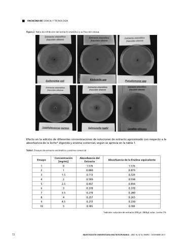 Figura 2 Halos de de inhibición del extracto etanólico y su fracción oleosa Efecto en en en la la adición de de de diferentes concentraciones de de de soluciones de de de extracto aproximado con con respecto a a a a a a a a la la absorbancia de la la la leche* digerida y enzima comercial según se se aprecia en en la la la tabla 1 Tabla1 Ensayos de extracto enzimático y y enzim enzima comercial Ensayo Concentración [mg/mL]