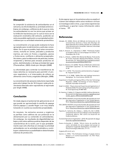 Sin duda alguna el el potencial de aplicaciones en en el el que puede ser aprovechada la la semilla de de papaya (Cárica papaya L ) puede llegar á a a a a a a a a ser muy amplia tomando en en en cuenta sus excelentes propiedades En resumen los extractos acuosos y orgánicos se perfilan como aditivos de uso potencial en en la la alimentación por su contenido en en en antioxidantes Sin embargo los resultados de digestibilidad son bajos y sólo estos aditivos podrían depender de de de las características de la ración por lo que probable- mente sean sólo efectivas en en sinergia la actividad antioxidante con con la actividad enzimática y contri- buyen a a a a determinar su posibilidad en en determinados sistemas de producción Es de esperar que en los próximos años se amplíe el número de trabajos sobre estos residuos e e e e e e incluso se investigue sobre otros y que estas experiencias contribuyan a a a a a a aportar nueva información sobre el tema Referencias