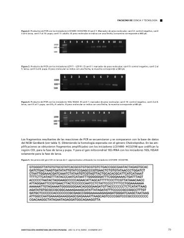 Figura 2 2 2 Productos de de PCR con con los iniciadores LCO1490- HCO2198 El carril carril carril 1: Marcador de de peso molecular carril carril carril 2: control negativo carril carril carril 3 al al 6: larva carril carril 7 al al 10: pupa carril carril 11: adulto El peso molecular se indica con una flecha la la la muestra corresponde a a a a a a a a a a a a a a a 680 pb Figura 3 Producto del PCR con con los iniciadores LEP LEP F1 – LEP LEP R1 El carril carril carril 1: marcador de de peso molecular carril carril carril 9: control negativo carril carril carril 2 al 5: larva carril 6 6 al 8: pupa El peso molecular se indica con una flecha la la la muestra corresponde a a a a a a a a a a a a 680 pb Figura 4 4 Producto del PCR con con los iniciadores 16SL-16SAH El carril carril carril 1: marcador de de peso molecular carril carril carril 10: control negativo carril carril carril 2 al 4: larva carril carril 5 al 7: pupa carril carril 8 8 y 9: adulto El peso molecular se indica con una flecha la la la muestra corresponde a a a a a a a a a a a a a a 680 pb Los fragmentos resultantes de de de las reacciones de de de PCR se se se se secuenciaron y se se se se compararon con la la base de de de datos del NCBI GenBank (ver tabla 1) Obteniendo la la la homología esperada con el el género Chalcolepidius En las am- plificaciones se obtuvieron fragmentos amplificados con los iniciadores LCO1490- HCO2198 que codifican la región COI para para la la fase de larva y pupa Y para para el gen mitocondrial 16S 16S 16S rRNA con con los iniciadores 16SL-16SAH solamente para la la la fase de larva Figura 5 Secuencia del gen COI en en en larvas de de C C C C approximatus utilizando los iniciadores LCO1490- HCO2198 INVESTIGACIÓN UNIVERSITARIA MULTIDISCIPLINARIA - - AÑO 16 16 No16 ENERO - - DICIEMBRE 2017
