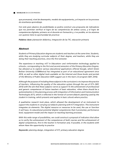 Students Students of Primary Education degree are students and teachers at at the same time Students Students while while they they are are studying curricular subjects of their degree and teachers while while they they are are doing their teaching practices since the the first semester The experience in in in teaching «ICT in in in Education» and «Information technology applied to schools» corresponding to the the first and second semesters of the the Primary Education Degree has allowed us us to explore various educational applications offered Google which Simón Bolívar University (USBMexico) has integrated as as part of an educational agreement since 2014 as as well as as other digital tools available on the the Internet and and those books and and portals of of the the Ministry of of Public Education (SEP) suggest use in in the the learn 2 2 0 0 program (SEP (SEP 2016) Although the the the the purpose of including these subjects in in in the the the the curriculum is «to improve the the the the practice of of of teachers influencing the the the quality of of of the the the education system through the the the use of of of ICT» (SEP 2013) with the the the aim that these subjects «serve as support To the the the achievement of of professional and generic competences of of future teachers of of basic education «then there should be a a a a a systematization in in in the planning process with integration of Information and Communication Technologies (ICT) which is reflected in in the the format of current didactic planning used by the the student in in in in training which presents and applies in in in in basic schools where practice A qualitative research took place which allowed the development of an instrument to to support the students in in in in in carrying out didactic planning with ICT integration This instrument integrates six elements: The digital resource resource or or resources to be used the use use or or function it it it it will have its educational potential (digital competencies that it it it it promotes) performance level equipment model and the impact on teaching-learning processes With this wide range of of possibilities we could construct a a a a a a proposal of of indicators that allow us to verify the the the achievement achievement of of of the the the competences of of of both courses and the the the achievement achievement of of of digital competences first in in in the the teacher in in in formation and if possible in in in the the students with whom Have the opportunity to practice Keywords: planning design integration of ICT primary education degree