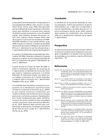 Los productos de PCR obtenidos correspondieron a aproximadamente 680 bp valor cercano a a a a a a lo lo espe- rado (710 pb Folmer et al 1994) Está reportado que las similitudes de de de de secuencias del gen COI pueden usarse para identificar la cercanía entre especies de distintos grupos taxonómicos como Drosophila yakuba Apis mellifera Artemia franciscana As- caris suum Cyprinus carpio Xenopus laevis y y Bos Taurus para lo lo cual se usan los iniciadores LCO1490- HCO2198 utilizados en este estudio (Folmer et al 1994) Aunado a a a a á a lo anterior el análisis de de identidad de de secuencia de de nuestros individuos correspondió al 87% con C silbermanni lo cual fue útil para situar a a a a a a C approximatus dentro de de de la especie de de de este género En cuanto a a a a los fragmentos secuenciados gen mito- condrial 16S rRNA obtenidos utilizando el material de de de de la la larva se obtuvo un porcentaje de de de de identidad del 87% con organismos del género Chalcolepidius sp como C silbermanni A pesar de de de que en la base de de de datos del NCBI no existe la información específica de de secuencias de de C approximatus la identidad de de secuencias indicó que nuestros organismos pertenecen a a a a a la familia Elateridae Es importante resaltar que existen po- cos trabajos moleculares de la la la familia Elateridae y ninguno hasta el momento de C approximatus (Sagegami-Oba et al 2006) Los resultados descritos hasta el momento son con- gruentes con la identificación taxonómica hecha con base en la descripción de de Zurita et al (2016) ya que que nuestras secuencias corroboraron que que nuestros individuos de de de las fases de de de larva y de de de pupa pertenecen a a a a a a la familia y al al género Chalcolepidius Esto resulta fundamental para poder identificar las larvas del primer estadio de de estos escarabajos usando únicamente claves taxonómicas (Benefer et al 2013) Nuestros datos servirán para com- plementar la descripción morfológica actualizada de de de las fases de de de larva y pupa de de de C approximatus (Zurita et al 2016) Conclusión