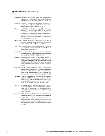 Sagegami-Oba R Oba Oba Y y y Ôhira H (2006) “Phylogenetic relationships of click beetles (Coleoptera: Elateridae) inferred from 28S ribosomal DNA: Insights into the evolution of bioluminescence in in Elateridae” En: Molecular phylogenetics and evolution 42(2) 410-421 Tamura K K Peterson Peterson D Peterson Peterson N N Stecher G Nei M y Kumar S (2011) ”MEGA5: Molecular Evolutionary Genetic Analysis using Maximum Likelihood Evolutionary Distance and Maximum Parsimony methods” En: Molecular Biology and Evolution 28: 2731 – 2739 Toki W y y y K K Kubota (2010) “Molecular phylogeny based on mitochondrial genes and evolution of host plant use in in the long-horned beetle tribe Lamiini (Coleoptera Ceramycidae) in Japan” Environmental Entomology 39 (4): 1336-1343 Voytas D (2000) Agarose Gel Electrophoresis current protocols in molecular biology John Wiley y y y Sons Appendix 1N Zurita-García M Villasana A Hernández-Hernández F y Morales-Garza M M (2016) “Redescripción e e e e e ilustración de de la la larva y pupa de Chalcolepidius approximatus Erichson 1841” En: Investigación Universitaria Multidisciplinaria 15: 77-84