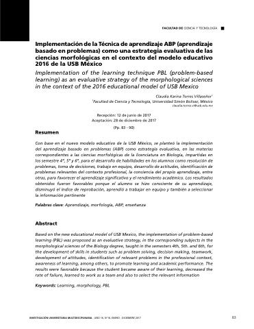 Implementación de de de la la Técnica de de de aprendizaje aprendizaje ABP (aprendizaje basado en en en en en en problemas) como una estrategia evaluativa de de de de de las ciencias morfológicas en en en el el el contexto del del modelo educativo 2016 de la USB México Implementation of of the the learning learning technique PBL (problem-based learning) as as an evaluative strategy of of of of the the the the morphological sciences in in the the the context of of of the the the 2016 educational model of of of USB Mexico