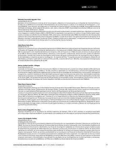 jliliadelgadov@outlook com Licenciada en en en en en Ciencias de de la la la Comunicación Comunicación y y Maestra en en en en en Comunicación Comunicación con especialidad en en en en en Estudios Culturales por la la la FCPyS de de la la la UNAM Doctora en en e Ciencias Humanas por la Universidad Simón Bolívar donde se se desempeña como Coordinadora Académica de de d de la Licenciatura en en Comunicación y Multimedios Sus líneas de de investigación trabajadas son intereses de de los grupos mediáticos para la transmisión de de de de de programas de de de de de índole deportivo por por televisión procesos de de de de de comunicación no verbal al al interior de de de de de instituciones capitalinas de de de de de reclusión así como propuesta axiológica para desalentar la militancia de de de de de jóvenes migrantes a a a a a a a a a a a a a a a a grupos delictivos de de de de de impacto internacional Prestó sus servicios profesionales en en en en la la Coordinación de de de Prensa de de de la la Dirección General de de de Prevención y Readaptación Social así como en en en la la Subdirección de de atención ciudadana del mismo organismo Ha colaborado en en en diversos medios como el el diario El Universal Grupo Editorial NOTMUSA y el el Instituto Mexicano de la Radio Cuenta con participación en en en diferentes congresos nacionales nacionales nacionales e e e e e e e e e e e e e e internacionales y y ha publicado los resultados de sus investigaciones en revistas nacionales nacionales nacionales y y extranjeras Actualmente es docente de de de la la la la la USBMéxico la la la la la FCPyS de de de la la la la la UNAM y y la la la la la Universidad de de de las Américas CDMX INVESTIGACIÓN UNIVERSITARIA MULTIDISCIPLINARIA - - AÑO 16 16 No16 ENERO - - DICIEMBRE 2017 91
