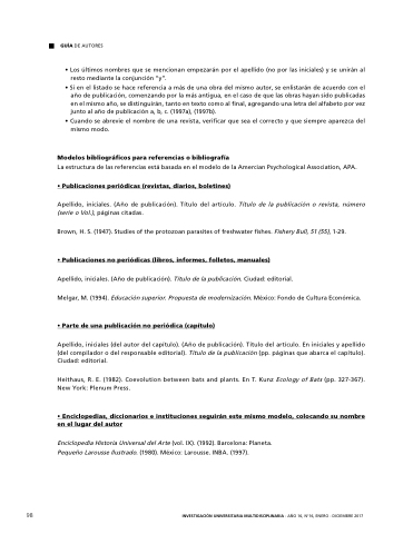 Ciudad: editorial Heithaus R E E E (1982) Coevolution between bats and plants En T Kunz Ecology of Bats (pp 327-367) New York: Plenum Press • Enciclopedias diccionarios e e e e e e e e instituciones seguirán este mismo modelo colocando su nombre en el el lugar del autor Enciclopedia Historia Universal del Arte (vol IX) (1992) Barcelona: Planeta Pequeño Larousse Larousse Ilustrado (1980) México: Larousse Larousse INBA (1997) 98 INVESTIGACIÓN UNIVERSITARIA MULTIDISCIPLINARIA - - AÑO 16 16 No16 ENERO - - DICIEMBRE 2017